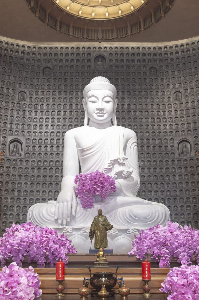 大雄寶殿中尊供奉釋迦牟尼佛由緬甸漢白玉所製成,高4m、重16…