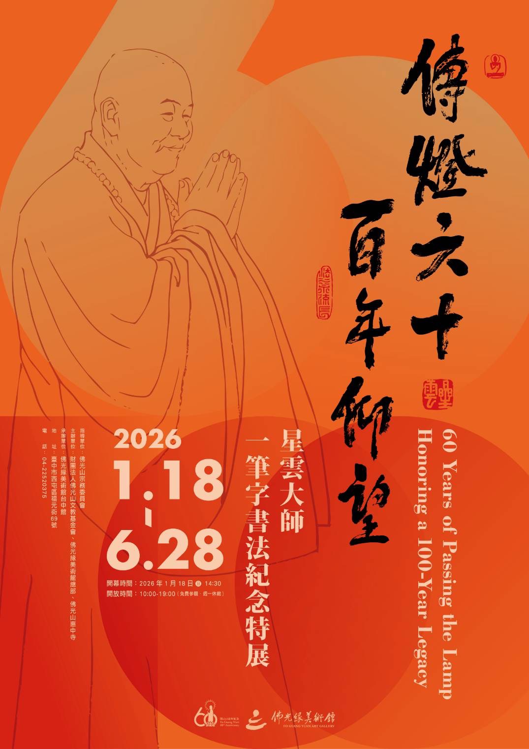 配合佛光山惠中寺喬遷新址,佛光緣美術館全球第17分館台中館新館首展。值此新館開幕之際,適逢佛光山開山六十周年、星雲大師百歲冥誕,佛光緣美術館總部特別策劃首展「傳燈六十.百年仰望——星雲大師一筆字書法紀念特展」,回望大師一生弘揚人間佛教的慈悲行願。此展亦為星雲大師圓寂後,「一筆字」首次於台灣公開展出,格外彌足珍貴。