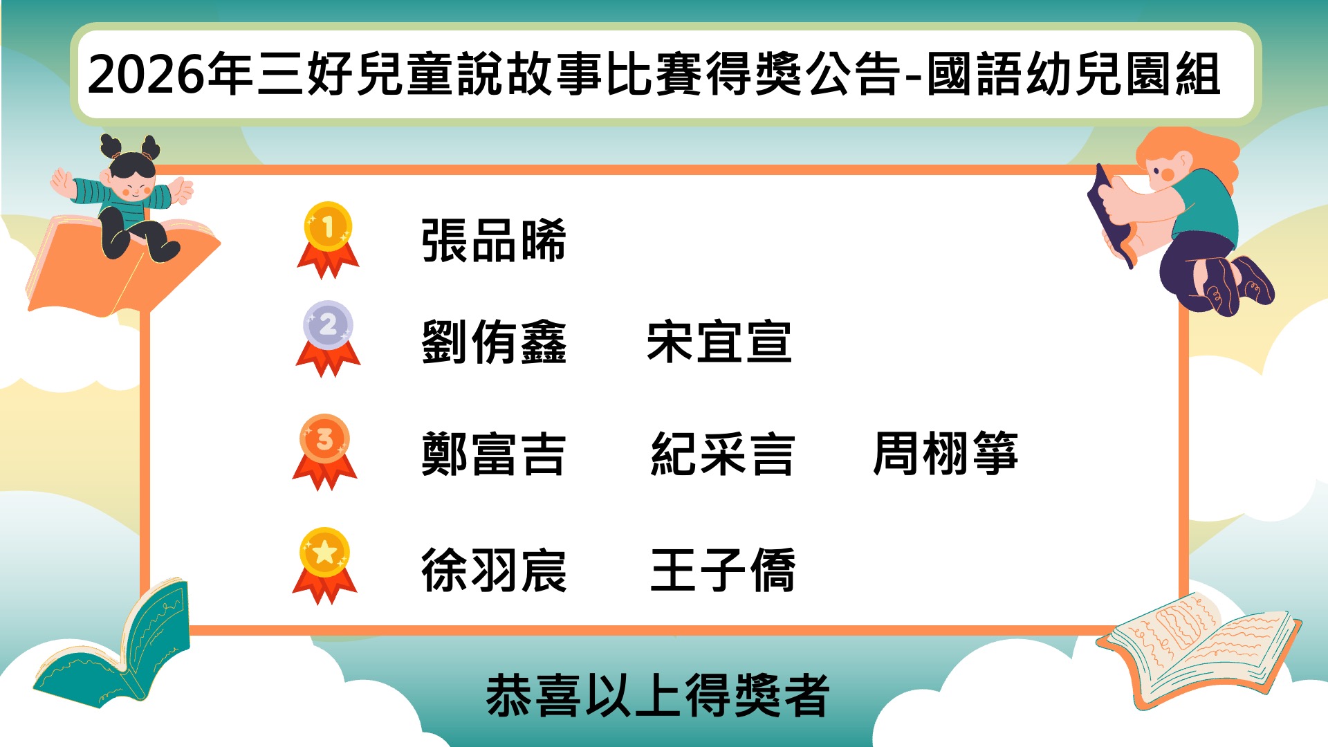 • 【活動公告】2026年三好兒童說故事比賽得獎公告-國語幼兒園組