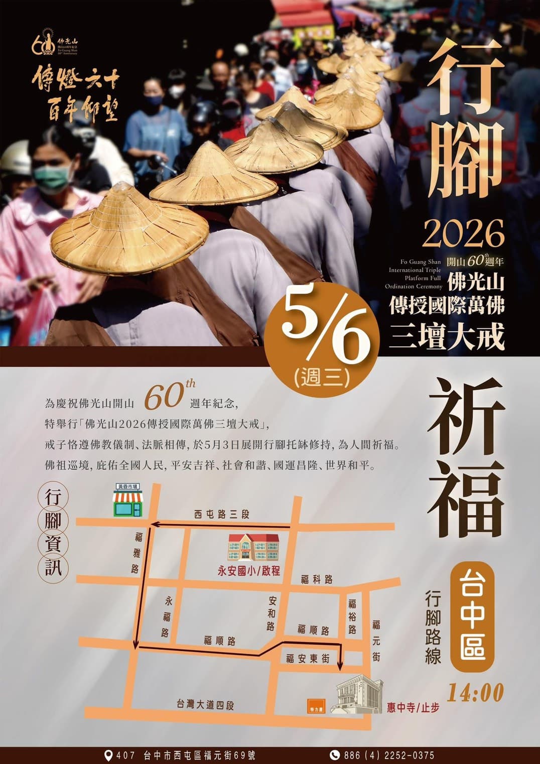 為慶祝佛光山開山 60週年紀念,佛光山特舉辦 「2026傳授國際萬佛三壇大戒 行腳祈福」 活動。
