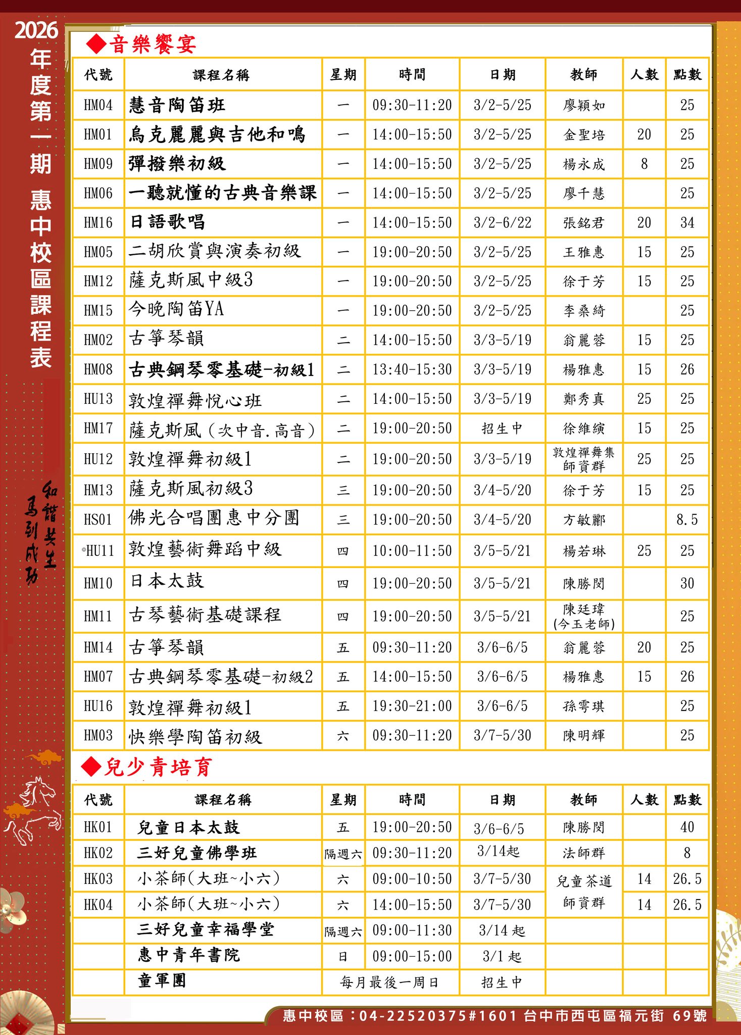 本期規劃多元課程內容,涵蓋佛學修持、生活藝術、身心成長、手作體驗等,無論是初學者或持續進修,都能找到適合自己的學習方向。
