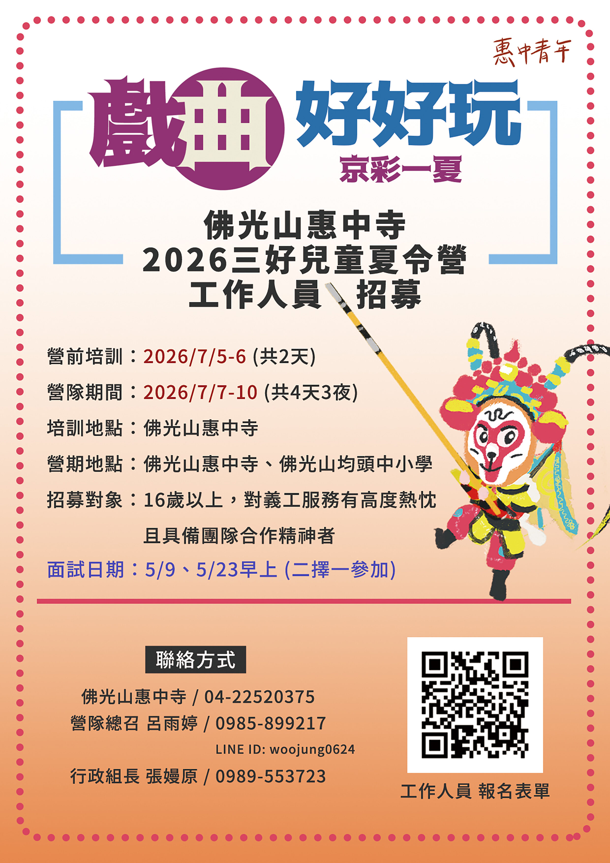 面試時間:5/9(六)或5/23(六) 早上實體面試 ,6/7(六) 高雄佛光山一日隊輔培訓。